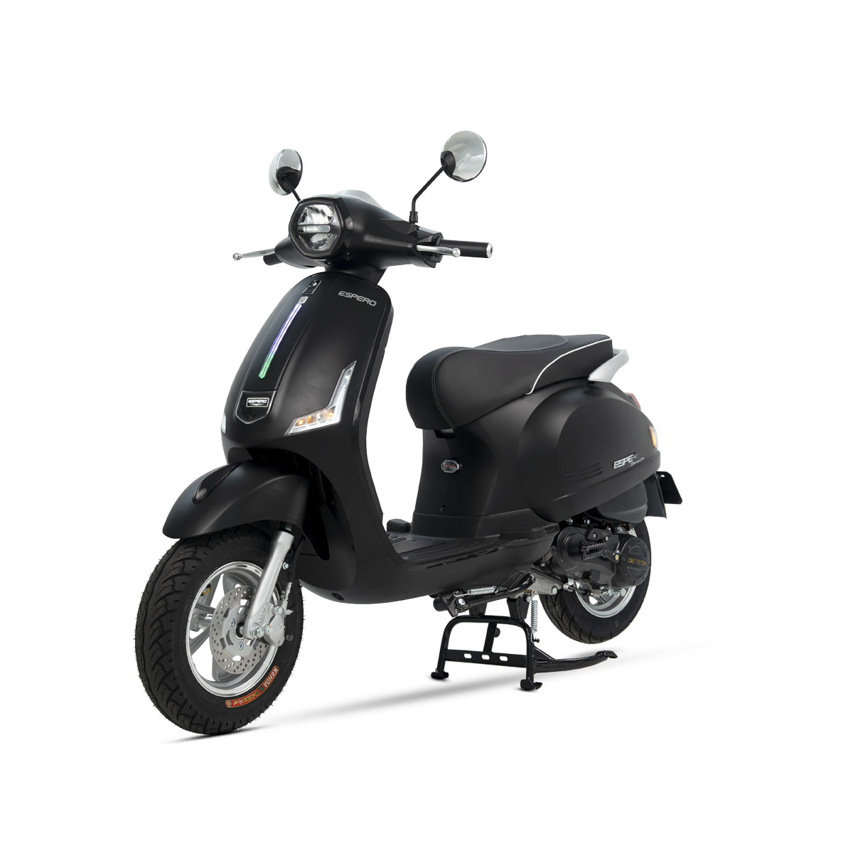 Một trong số những mẫu xe Detech chất lượng đáng chú ý là xe ga 50cc Espero VS Pro . Thiết kế của Espero VS Pro mang nét tương đồng với mẫu xe Vespa phân khối lớn, với sự trẻ trung và thanh lịch. Đặc điểm nổi bật của xe là đèn pha LED phân tầng theo hình dạng lục giác cá tính. Tạo một ấn tượng mạnh mẽ đối với người nhìn. Bộ đèn pha và đèn hậu được thiết kế đồng bộ với bộ điều khiển xe trên tay lái. Giúp người lái dễ dàng điều khiển xe khi di chuyển.